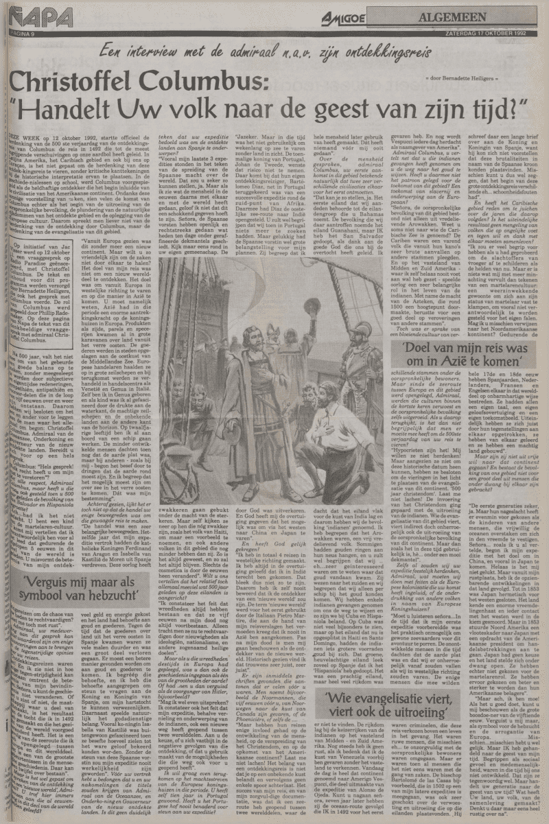 Tekst en inhoud van dit programma werden verzorgd door Bernadette Heiligers, die ook het gesprek met Columbus voerde. De rol van Columbus werd gespeeld door Phillip Rademaker. De bewerking van dit vraaggesprek verscheen op 17 oktober 1992 in Ñapa, de weekendbijlage van de Amigoe.